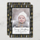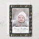 Send customizable and personalized holiday greetings to friends, colleagues and family in simple, minimalist, elegant, fun, festive and modern photo cards! A beautiful frame of variety of gold and white Christmas Forest Pine Trees on black background surrounds your photo on round edge paper. The greeting " Merry Christmas " is written in elegant calligraphy, and below features your custom greeting message from your family name in modern typography. Reverse to reveal a beautiful the full Christmas Forest Pine Trees pattern background.