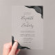 Two corners of this elegant modern wedding invitation feature black watercolor agate trimmed with faux silver glitter. The customizable text combines handwriting, copperplate and italic fonts in charcoal grey on a clear background.