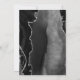 The left-hand edge of this elegant modern wedding save the date card features a black watercolor agate border trimmed with faux silver glitter. The customizable text combines charcoal grey handwriting, copperplate and italic fonts on a white background. The reverse side features a matching black and silver agate design.