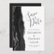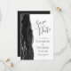 The left-hand edge of this elegant modern wedding save the date card features a black watercolor agate border trimmed with faux silver glitter. The customizable text combines charcoal grey handwriting, copperplate and italic fonts on a white background. The reverse side is solid off-black.