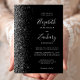 The left-hand edge of this elegant modern wedding invitation features a silver faux glitter design. The customizable text combines real silver foil handwriting, copperplate and italic fonts on a black background. The reverse side features a matching black and silver glitter design.