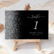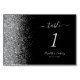 The left-hand edge of this elegant modern wedding table number features a silver faux glitter design. The customizable text combines silver grey handwriting, copperplate and italic fonts on a black background.