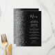 The left-hand edge of this elegant modern wedding menu features a faux silver glitter border. The customizable text combines silver grey whimsical handwriting script and copperplate fonts on a black background. The reverse side features a matching black and silver glitter design.