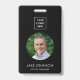 Modern black employee staff badge with a photo, QR code, company logo and employee's name and job title. You can easily customize it with your business details.