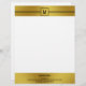 At the top, there's a display initial you can edit to show the right monogram. The black letter is inside a faux gold square that has a black border. Black lines are on both sides of the square. At the bottom, there are four lines of black display text for your custom text such as a name, professional title, address, phone number, website, or email address. The faux gold elements are not made of foil.