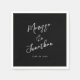 This modern personalized wedding paper napkin features hand lettered white script with your names and wedding date on a simple black background. Designed by artist Susan Coffey.