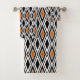 Bathroom towel set featuring a black, white, and orange diamond pattern.
