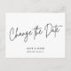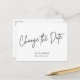 Custom-designed wedding postponement/change the date postcard featuring modern black and white hand lettering design.