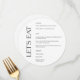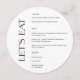 Modern wedding menu card with unique typography for "Let's Eat" and your wedding menu in clean sans serif font. Classic black and white colour scheme and your names and wedding date on the back - customize or delete the text on the back and use this menu card for birthdays, rehearsal dinners, anniversaries or any other celebration and party.