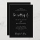 These modern, simple and elegant wedding invitations feature a minimalist white text design with stylish handwritten script on a black background.