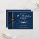A modern black and blue 90th birthday party invitation featuring a black and blue gift bow with a diamond embellishment on the top of the knot. Stylishly presented in white text. Relevant details are easily exchanged for your information for your special event.