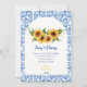 Planning an italian mediterranean themed wedding or using sunflowers in your bouquet or in your centerpiece decorations? Then you will love this classic one of a kind combination of blue and white modern tiles with eucalyptus sunflower wedding invitation design ! Customize with your details
