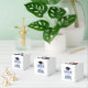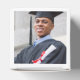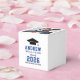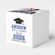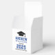 Modern graduation party favour boxes feature a senior photo, grad cap, and simple and black and royal blue typography design that can be personalized with the graduate's name and school. White background and text colours can be customized to match school or party theme colours.