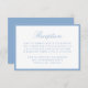 This reception enclosure card features “Reception” in elegant light blue calligraphy with classic serif lettering for your reception details below. A soft blue border frames the card, creating an airy, refined look that feels clean and timeless. The balanced layout offers a graceful way to present your reception information, making this enclosure well-suited for summer weddings, coastal venues, and classic celebrations.
