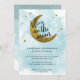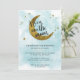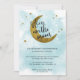 Of course you are over the moon and expecting a baby boy! A modern teal blue watercolor wash in the background with the moon and the stars in gold baby shower invitation. 'We're Over the Moon' is written in a stylish calligraphy.