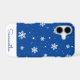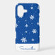 This cute Christmas iPhone 12 case features a trendy winter pattern with white stars and snowflakes on a blue background. Personalize it with a name in the matching handwriting font.