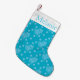 Modern blue and white Christmas tree and snowflake pattern on personalized Christmas stocking.