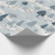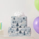 A modern, soft snowy blue and cream Christmas village pattern dotted with small, detailed houses and monochromatic blue trees.