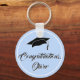Simple and Modern Blue Congratulations Graduation Keychain with a graduate name, graduation cap, modern white typography text Congratulations. Personalize with your name.