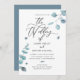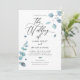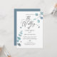 Design features blue eucalyptus branches and leaves and modern type/font. The wedding invitation can be easily customized for your event by adding your event details, font style, font size & colour, and wording of your choice by clicking on the 'Personalize' button.