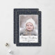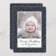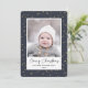 Send customizable and personalized holiday greetings to friends, colleagues and family in simple, minimalist, elegant, fun, festive and modern photo cards! A beautiful frame of variety of gold winter stars on navy blue sky background surrounds your photo on round edge paper. The greeting " Merry Christmas " is written in elegant calligraphy, and below features your custom greeting message from your family name in modern typography. Reverse to reveal a beautiful the full gold winter stars on navy blue sky pattern background.