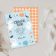 Sweet boy's Halloween themed baby shower thank you card featuring some ghosts,pumpkins, bats, mushrooms and foliage. This our little boo is on the way baby shower thank you card is ideal for an October baby shower for a baby boy.