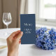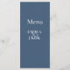 This modern wedding menu features a sophisticated blue and white colour palette with elegant serif typography. The minimalist front displays each course in a clear, organized layout, from entrée to dessert, with bold section headings for easy reading. The couple’s names are highlighted at the bottom for a personalized touch. The reverse side features a solid blue background with the menu title and names, creating a cohesive and contemporary look. Perfect for formal, elegant, or French-inspired celebrations.
