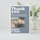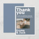 A modern minimalist wedding thank you design with a bold "Thank you" headline and clean typography. The dusty blue background and white text frame a favourite photo for a timeless, editorial look. Ideal for elegant celebrations, beach weddings, and contemporary couples. Simple, calm and stylish.