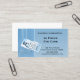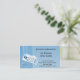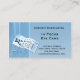Modern business card for optometrist or eye care specialist with eye chart and wire rimmed glasses on blue background.