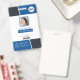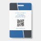 Professional identification card with photo, logo, barcode, and qr code templates included. This modern design style has shades of blue; a navy blue, medium blue, and light blue with white base. Similar design on back, with business address, website address, and a website qr code.