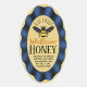 Modern blue ribbon border over a gold background featuring a bumble bee graphic at the centre to create your own elegant honey jar stickers. Customize the text with the brand name of your beekeeping business, contact information, type of honey, weight, and date, Designed for oval and queenline honey jar containers, upside down squeeze bottles and quart mason jars.