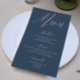 Introduce a touch of modern elegance to your reception with this dark blue wedding menu, featuring chic rose gold typography. Designed with simplicity and style in mind, this menu pairs the deep, sophisticated blue background with refined rose gold text, creating a stunning contrast that’s both eye-catching and elegant. Perfect for contemporary weddings, this menu complements a variety of themes, offering a polished and cohesive look for your tablescape while beautifully presenting your culinary selections to guests.