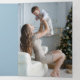 Elegant modern holiday design featuring your keepsake photo in an arch-shaped cutout template with opaque white border, abstract watercolor style light blue and white winter greenery and sparkles of white snow on pastel blue watercolor effect background. Includes editable text fields and photo templates on front and panels.