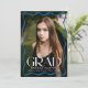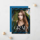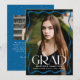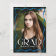 Celebrate your high school or college graduate with this elegant graduation announcement, featuring a full-bleed vertical photo framed by a stylish blue wavy border. The bold white "Grad" lettering makes a statement, while the graduate’s name, school, and class year add a personal touch. The back showcases a horizontal photo with space for a custom message, making it the perfect way to share this special milestone with family and friends.
