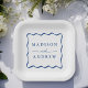 Add a stylish touch to your wedding reception, rehearsal dinner, engagement party, or wedding shower with these Modern Blue Wavy Frame paper plates. The retro wedding paper plates display the couple's names in bold blue lettering surrounded by a blue wavy border contrasting with a white background. The trendy wedding paper plates were designed to coordinate with our Modern Wavy Frame wedding collection.