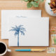 Customize this elegant design featuring modern script typography with your name and return address on the back flap. An artistic blue palm tree adorns the front while the inside of the envelope features a white palm tree pattern over a blue background. If you need help or matching items, please contact me.