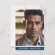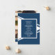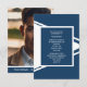 Create modern blue and white photo graduation announcement cards to send to family, friends, and coworkers. One side features the details of the graduation along with information for the celebration party. The other side displays your photo of the graduate as well as the class year. Use the template to personalize.