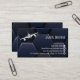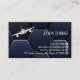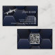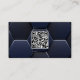 This design features a minimalist, stylish, professional business card with a blue honeycomb like pattern background and white coloured text, images and icons. The front includes an illustration of a white airplane and icons, followed by a customizable option to add your own name, and contact information (telephone number, e-mail, website, mailing address). The back design features an option to upload your very own scannable QR code.