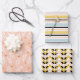 Trendy wrapping paper sheet set featuring geometric and floral patterns in blush pink, white, mustard yellow and black colour combinations.