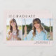 This modern graduation announcement and party invitation features a pretty blush pink and black colour palette, simple typography, and two photos. At the top of the grad announcement, the word "Graduate" is written in simple, all caps lettering, with the graduation year to the left. Below, add two photos of the new graduate. The graduate's name and school are written at the bottom right of the design. On the back, you'll find a template for graduation party details.