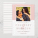 Modern wedding save the date announcement cards feature a square engagement photo framed in light blush / rose petal pink with a simple and minimalist style monogram of the bride and groom names with an elegant script ampersand. Personalize the save the date wording with the wedding date and location. The back of the card includes a sleek pattern of thin dusty rose / mauve pink and white horizontal stripes.