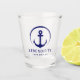 A chic minimal nautical-themed shot glass for your boat that features a modern navy blue illustration of an anchor. Personalize with your boat's name and location in simple navy blue typography.