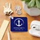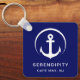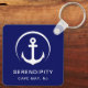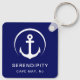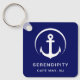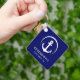 A modern nautical-themed keychain for your boat that features a white illustration of an anchor in a circle on a navy blue background. Personalize with your boat's name and location in simple white typography.