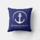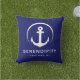 A chic minimal nautical-themed outdoor pillow for your boat that features a modern white illustration of an anchor on a navy blue background. Personalize with your boat's name and location.