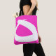 This cool boho tote bag features a simple while attractive design, composed by a playing white line that makes a different draw on each side: one is very fine in circular shapes and the other is thicker, generating an irregular expressive triangle. The background is fuchsia.