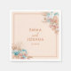 A modern and elegant boho wedding napkin, with blue and terracotta watercolor florals at the corners. Customize with your names and wedding date.