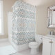 Modern and fun beachy boho vibe style shower curtain with teal, peach, and pale grey in a watercolor wash chevron and diamond pattern.