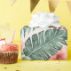 Modern tropical wrapping paper design featuring monstera, banana and palm leaves watercolor illustrations together with pink hibiscus flowers on a cream coloured background.
