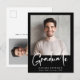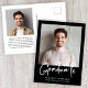 Modern black graduation announcement postcard with your photo and "Graduate" in a bold white script. Add the grad's name, school and class year in simple white typography. On the reverse side, add an additional photo and personalized message, or leave blank.