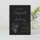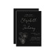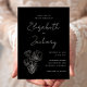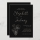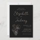 This modern wedding invitation features cream-coloured text on a black background. A line art floral design appears in the lower left corner. Add the names of the bride and groom in stylish cream handwriting script and the details in sans serif font.